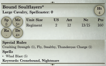 Bound Soulflayers Gallery Bound Soulflayers Unit Bound Soulflayers 3rd Edition Rules Twilight Kin Named Heroes Mikayel, Lord of Nightmares - La'theal Bleakheart - Vice Admiral Phoebus Darkheart General Heroes Summoner Crone - Twilight Assassin - Soulbane on Nightmare - Captain on Void-Skiff - Void Captain - Impaler Soulbane - Bound Butcher Fleshripper - Navigator on Void-Skif - Bound Voidlurker - Navigator - Pride of the Dark Fleet Named Infantry Captain Horgoth's Horrors Basic Infantry Bound Reapers - Corsair Fleetwardens - Corsair Voidwalkers - Reavers of the Middle Sea - Veterans of the Celestial War Large Infantry Bound Ravagers - Bound Butchers Named Heavy Infantry The Gunnery Crew of the Duriel Heavy Infantry Bound Phantoms - Corsair Wranglers - Voidtouched Mutants - Voidtouched Weavers Monstrous Infantry Infantry Impalers Large Cavalry Bound Soulflayers Chariots Corsair Void-Skiffs Monster Bound Mind Screech Titan Goredrake - Bound Terror Retired Blade Dancers - Cronebound Fiends - Twilight Gladestalkers - Blade Dancer Neophytes - Soulbane on Dread-fiend - Cronebound Abyssal Horsemen - Cronebound Shadowhounds - Cronebound Gargoyles - Cronebound Shadow-hulk - Soulbane - Cronebound Archfiend - Cronebound Banshee - Cronebound Archfiend Heroes La'theal Voidheart Core The Void Sisters - The Rejects Support Captain Grimdance Commmand Executioner Spellcaster Summoner Crone Support Shadowhound - Blade Dancer Large Butcher Warrior Impaler - Shadow Grunt Citizen Levy Kings of War, Vanguard, Armada, Pannithor and all associated names, places and things are TM and copyright Mantic Games. Artwork and logos used with permission. This wiki is not an official Mantic Games publication. Categories: Army UnitsTwilight Kin