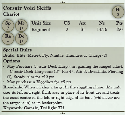 Corsair Void-Skiffs is a peculiar vessel employed by the Twilight Kin that harnesses the twisted emanations of the dimensional seas to propel itself over any terrain.