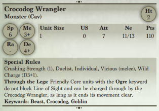 Crocodog Wrangler is a Monster (Cavarly) unit for the Ogres faction and was introduced in Kings of War – 3rd Edition Rulebook.
