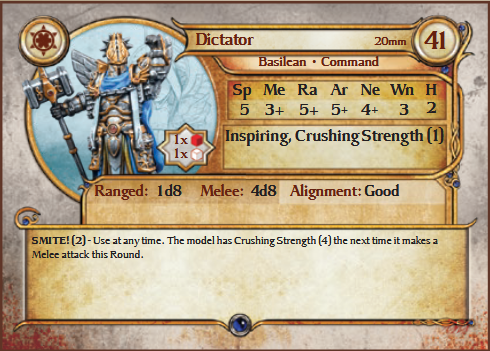 Dictator is a hero unit for the Order of the Brothermark and Basileans.