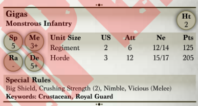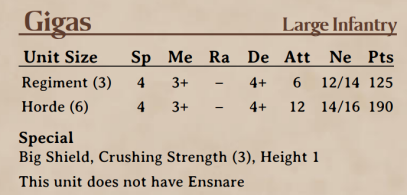 Gigas were introduced as a Large Infantry unit in 2.0 - Uncharted Empires 2nd Edition Rulebook for the Trident Realms which has continued into 3rd Edition.