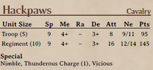 Hackpaws have been an Cavalry unit for the Ratkin faction since their introduction in Kings of War 2.1 - Uncharted Empires 2nd Edition Rulebook supplement book.
