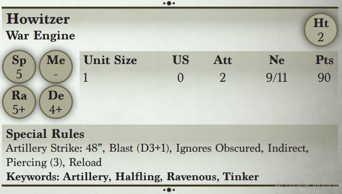 Howitzer is a War Machine for the Halflings Faction and was introduced in [[Kings of War 3.3 - Clash of Kings 2022]