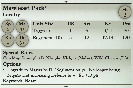 These beasts are herded into battle by a group of enthusiastic goblin handlers, each optimistic in their hopes of becoming Jo’os new handler on the off chance that the mawbeast alpha ever eats his current master.