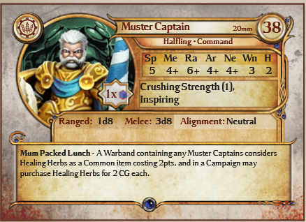Muster Captain is a Hero (Inf) and upgradable to Hero (Cav) unit for the Halflings faction.
