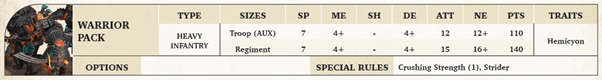 Warrior Pack is an Hemicyons infantry infantry unit for the Xirkaali Empire.