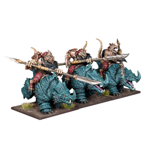 Rhinosaurs are only rideen by Ancient Salamanders who granted the honour of thundering to battle on the near unstoppable Rhinosaurs. These blocky brutes live in herds on the fertile plains and both Raptors and Rhinosaurs have learnt to live with and avoid each other.