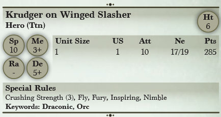 The most powerful Krudgers ride massive Slashers, great winged carnivorous reptiles, all fangs, claws and bad attitude. Only an equally lethal orc leader can even think of using one as a mount.