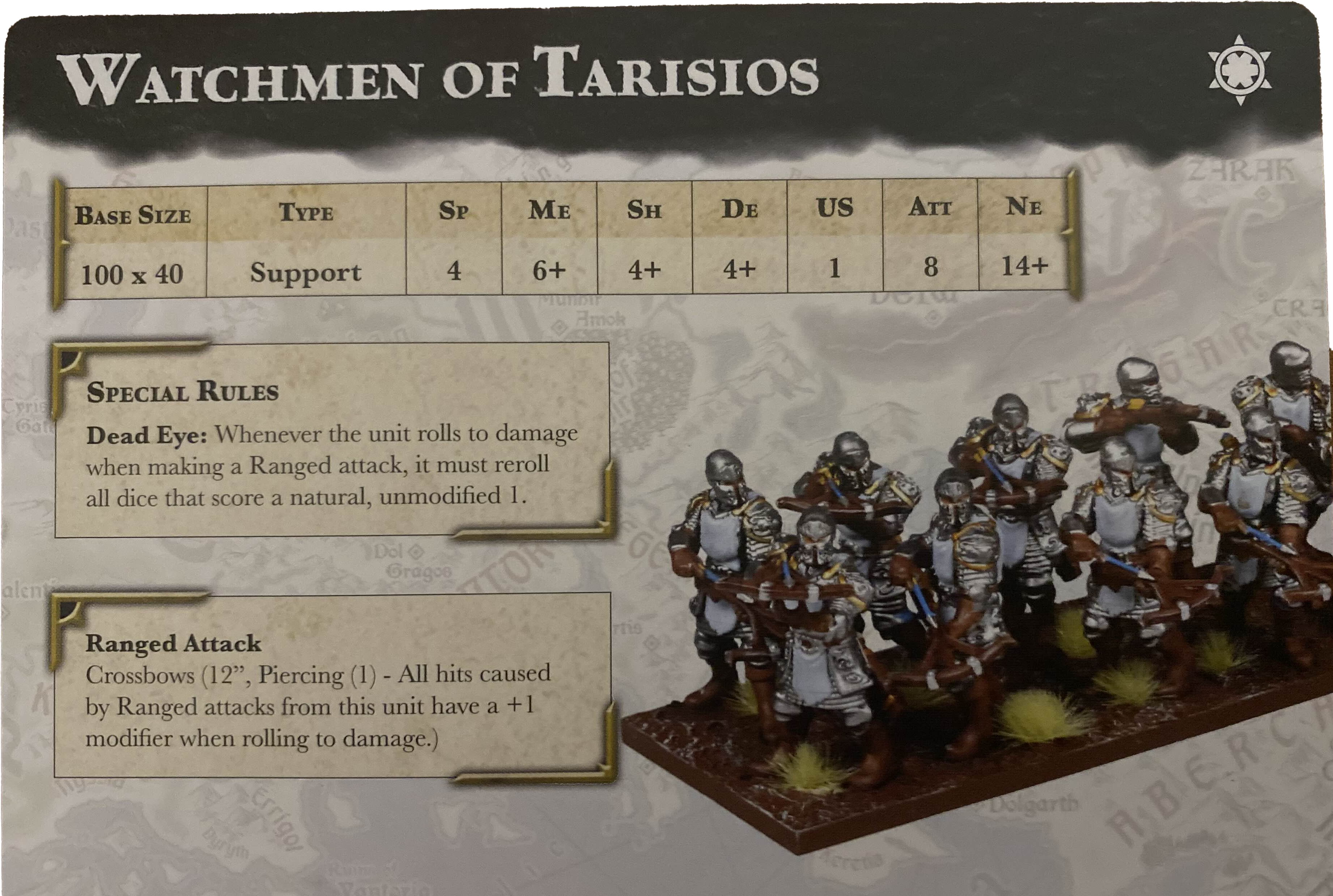 Watchmen of Tarisios is a support type unit for Kings of War Champions for the Basileans and are from the city of Tarisios.