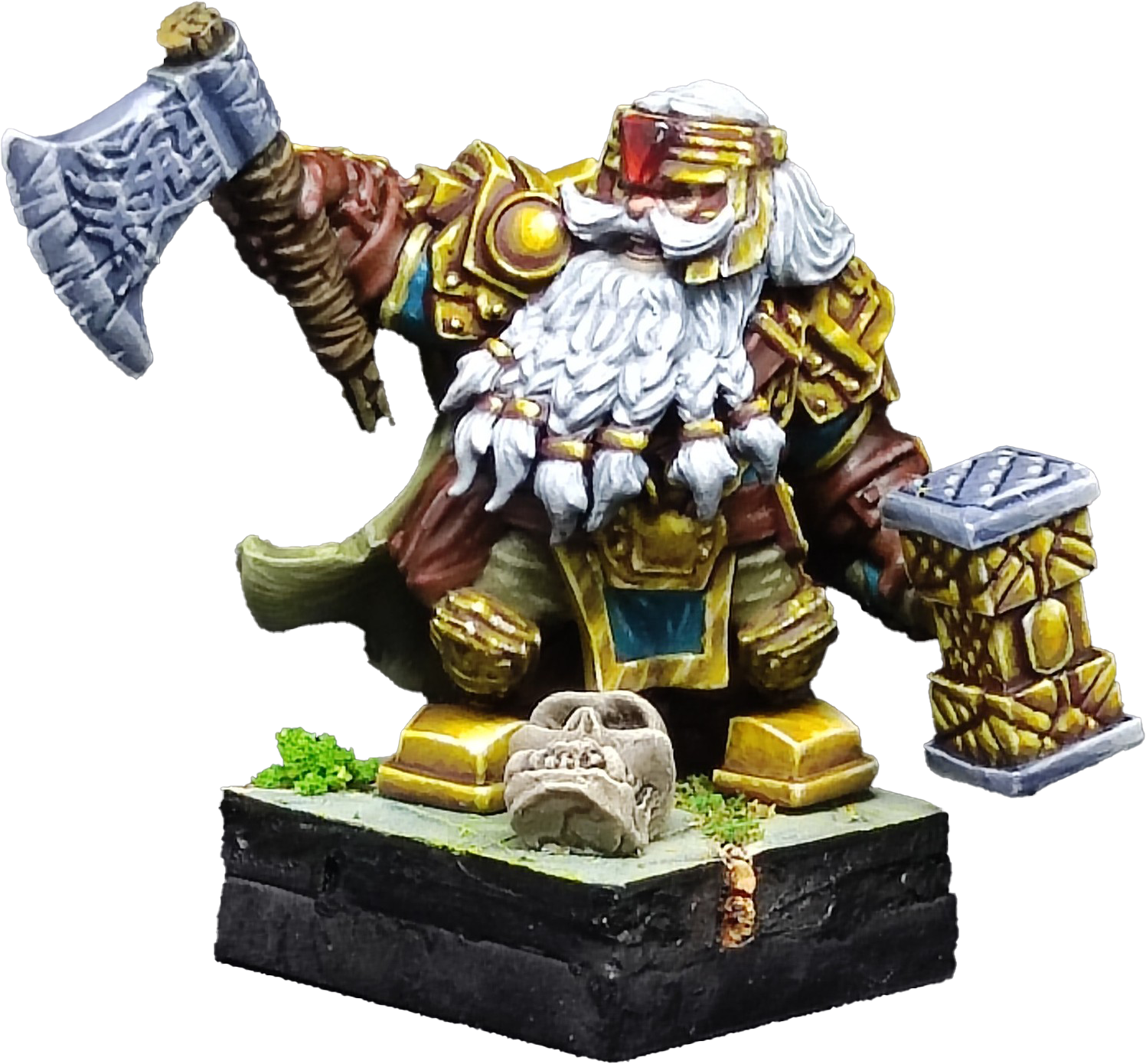 The Heavyhand Clan was thus dishonored. Garrek was born with this shame, as all in his clan are, but he sought to lift it. Leading his clan into battle, he thwarted both undead and orc forces who sought to crush the Golloch Empire. Naturally this has not impressed the stubborn dwarfs, so his family continues to live in shame. Garrek has also sought out the missing artifacts, wielding two in battle himself: the Warp Hammer and the Cloak of Miph. Garrek has obtained the Comb of Elesea. He has recovered 16 others, but still 9 remain missing.
