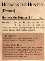 *[[Kings of War – World of Pannithor]]|hometown=[[Crag Gallen]]|events=[[The Retaking of Cwl Gen]]|items_held=[[The Skewerer]]|appearance=Black beard with bits of Grey and White throughout. Wears a Green Cloak and Brown Tunic|image2=|logo1=free-dwarfs-icon.png|model_kit=Dwarf Character: Herneas the Hunter|status=Active|3rd_edition=[[:File:Herneas3rdEditionStats.png|Yes]]|store_link=[https://www.manticgames.com/kings-of-war/dwarfs/dwarf-herneas-the-hunter/ Mantic Store]|1st_edition=[[:File:Herneas1stEditionStats.png|Yes]]|2nd_edition=[[:File:Herneas2ndEditionStats.png|Yes]]|location=[[Cwl Gen]]|Lore Status=Alive}}'''Herneas''', also known as '''Herneas the Hunter,''' is a [[Free Dwarfs|Free Dwarf]] and leader of [[Herneas’ Handpicked Rangers|Herneas Handpicked Rangers]]. He carries around a magical crossbow called [[The Skewerer]]  | |||