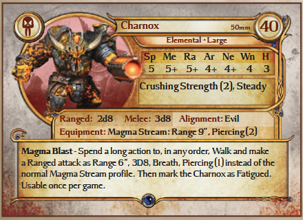 Created by only the most adept Iron-Casters, the Charnox is a terrifying construction of broiling magma and arcane sorcery. Armed with a Magma Cannon, it often joins the ranks of the golems to offer some devastating fire support.