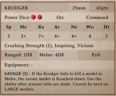 Some will march into battle alongside the other orc infantry, showing their martial prowess to their rivals firsthand. These leaders surround themselves with the strongest, most capable warriors, for a Krudger with weak warriors will die in ignominy rather than glory.