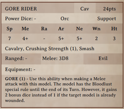 They need little reason to disembowel anyone who gets too close, making them perfect battle-mounts for the bloodthirsty orcs. A regiment of orcs mounted on gores can sweep aside all but the most determined opposition.