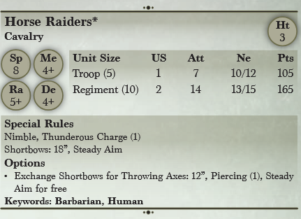 </gallery>|type=Cavalry|faction(s)=[[Varangur]]|race(s)=[[Human]]|logo1=[[file:Varangur-icon.png|link:Varangur|100px]]|status=Active|3rd_edition=[[:file:Horse_Raiders3rdEditionRules.png|Yes]]|games={{kingsofwarlogo}}}}'''Horse Raiders''' | |||
