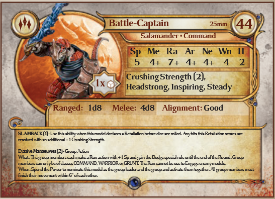 </DPL>|store_link=[https://www.manticgames.com/kings-of-war/salamanders/salamander-battle-captain/ Mantic Store]|games={{kingsofwarlogo}}{{vanguardlogo}}|Keywords=Salamander|Current Special Words=[[Crushing Strength (n)|Crushing Strength (2)]], [[Individual]]|Vanguard=Yes}}'''The Battle-Captains''' are superior warriors and tacticians in the prime of life. | </DPL>|store_link=[https://www.manticgames.com/kings-of-war/salamanders/salamander-battle-captain/ Mantic Store]|games={{kingsofwarlogo}}{{vanguardlogo}}|Keywords=Salamander|Current Special Words=[[Crushing Strength (n)|Crushing Strength (2)]], [[Individual]]|Vanguard=[[:file:Battle-Captain3rdEditionStats.png|Yes]]}}'''The Battle-Captains''' are superior warriors and tacticians in the prime of life. | ||