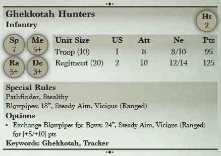 Ghekkotah Hunter packs that have worked together for years will supply the villages with food from the jungles and, when foraging further afield, the plains that stretch to the far-off shores of their homelands.