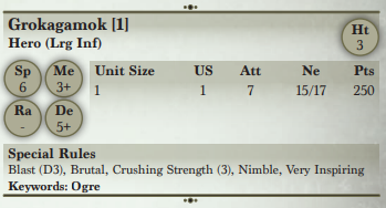 Given his enormous length of experience, Grokagamok has acquired a wealth of tactical and strategic expertise which surpasses even that of his fellow ogres. Few indeed are the battlefield tricks which Grokagamok has not learned, perfected and even adapted, and never in the long and storied history of the Granite Fists has the band been defeated, no matter the foe.