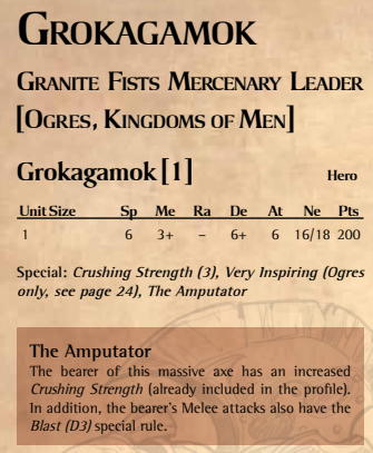 Leader of the infamous Granite Fists mercenary company, Grokagamok is undoubtedly the most renowned and successful Ogre mercenary captain in the world. Though he prefers to work with humans (they tend to be happier to pay and more likely to stay out of the way and let him and his troops get on with it), he has worked with most races at some point or other.