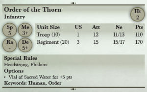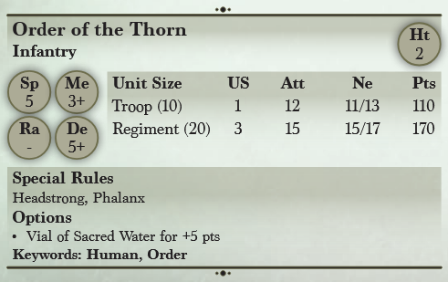 Basic Infantry | Order of the Brotherhood on Foot - Men-at-Arms Retainers - Order of the Thorn - Naiad Ensnarers (forces of nature) | |||